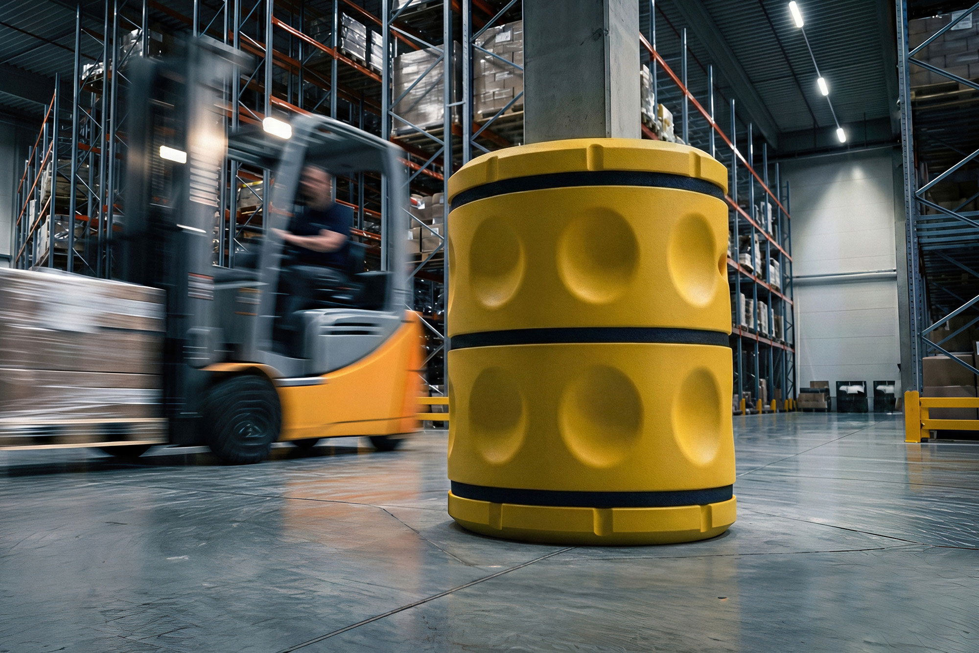 Unlike rigid steel bollards that transfer impact energy into the floor, these guards act as a shock absorber. The low-density plastic shell creates a cushion of air that deforms on impact, reducing damage to the forklift and preventing the “shock” from cracking the column’s concrete footing.
